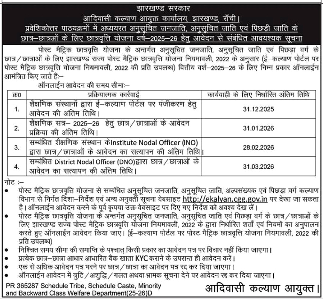 ई-कल्याण झारखंड पोस्ट मैट्रिक छात्रवृत्ति 2025-26 से जुड़ी सभी महत्वपूर्ण जानकारी निचे दी गई है । यह छात्रवृत्ति झारखंड के अनुसूचित जनजाति (ST), अनुसूचित जाति (SC), और पिछड़ा वर्ग (BC) के छात्रों के लिए एक बहुत बड़ा सहारा है।